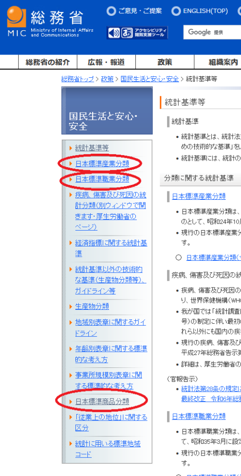 産業分類・職業分類・商品分類があります。総務省系以外の軸にJISがあります。