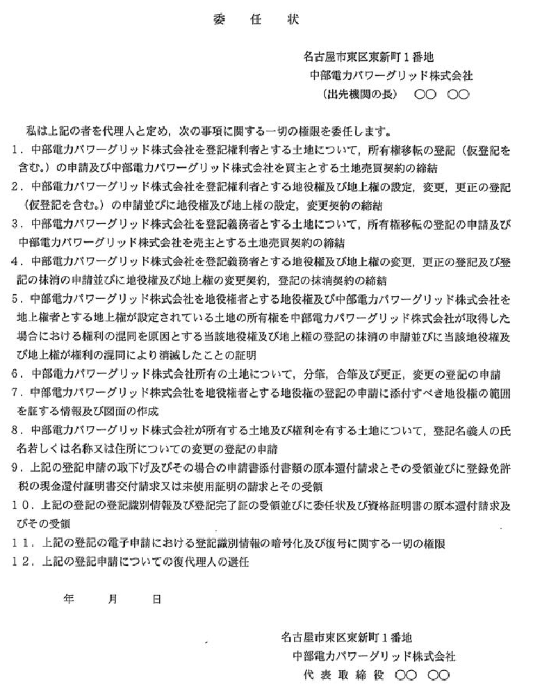 つきましては,中部電力パワーグリッド株式会社においても従来と同様に,別紙様式の委任状を使用して登記申請を行うことといたしたいと考えますので,ご多用中恐縮ではありますが,なにぶんのご教示を賜りたく,ご照会もうしあげます。