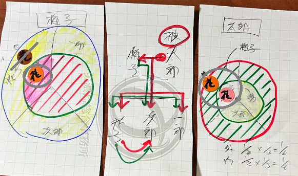 まず、赤線のうち1/6たる丸桃部分(右図の内円の9時の方向の1/6)が花子に落ちます(これを①とします)。同時に、右図の外円は梅子で3/6あります。ついで、梅子死亡により外円の9時の方向のシフォンケーキ部分(丸橙部分)が花子に落ちます(これを②とします)。