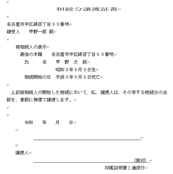 ですから、次の相続分譲渡証明書も登記所で通ると考えます。しかし、根拠文献や事例が見つかりませんので裏付けがありません。否定する理由や理屈がないからそう考えるしかないというところです。